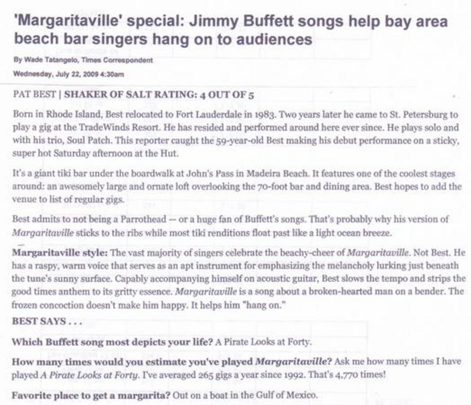 You can catch Pat Best at the Guy Harvey Resort every Thursday from 6pm to 9pm and every Saturday in Clearwater at the Sand Pearl Resort from 1pm to 4pm. Pat also plays regular gigs at the St Pete Yacht Club, Frenchy's Outpost in Dunedin, Rum Runners and Harry's at the Sirata and the Clock Tower Sports Bar in Treasure Island.